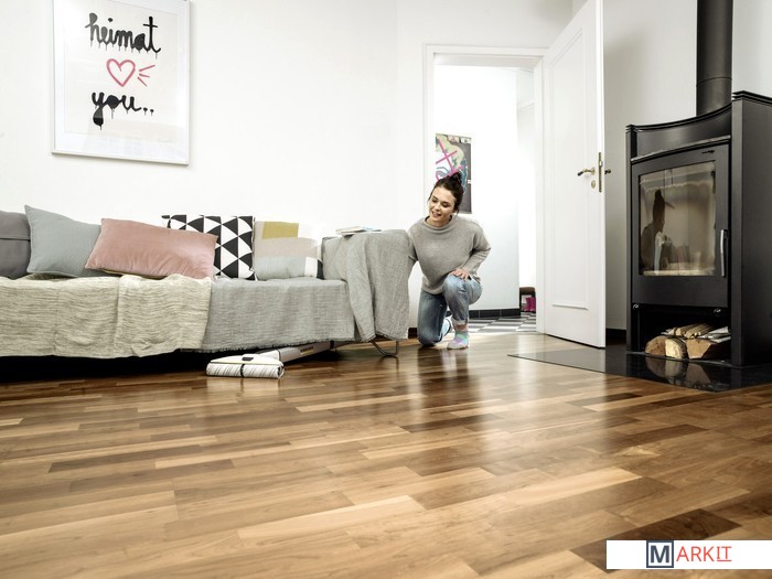 Утомительная уборка при помощи ведра и швабры осталась в прошлом: аппарат для влажной уборки пола EWM 2 Premium с шарнирным креплением щеточной головки позволяет легко удалять брызги и пятна со всей его поверхности, в т. ч. вплотную к стенам и в труднодоступных местах. Узкая форма корпуса аппарата значительно облегчает очистку пола под мебелью или рядом с плинтусами. При этом эффективность уборки оказывается значительно (до 20 %) большей, чем при использовании обычной швабры*. Вращающиеся роликовые щетки аппарата постоянно увлажняются чистой водой, а грязная вода собирается в предусмотренный для этого бачок, благодаря чему пол высыхает уже через 2 минуты после уборки. Мощный литий-ионный аккумулятор позволяет примерно за 20 минут очистить самые разнообразные напольные покрытия (керамическую плитку, паркет, ламинат, ПВХ, винил и т. д.) площадью до 60 м². В комплект поставки аппарата EWM 2 Premium включены две пары роликовых щеток (универсальных и для уборки каменных полов), универсальное чистящее средство (500 мл) и средство для уборки каменных полов (30 мл).